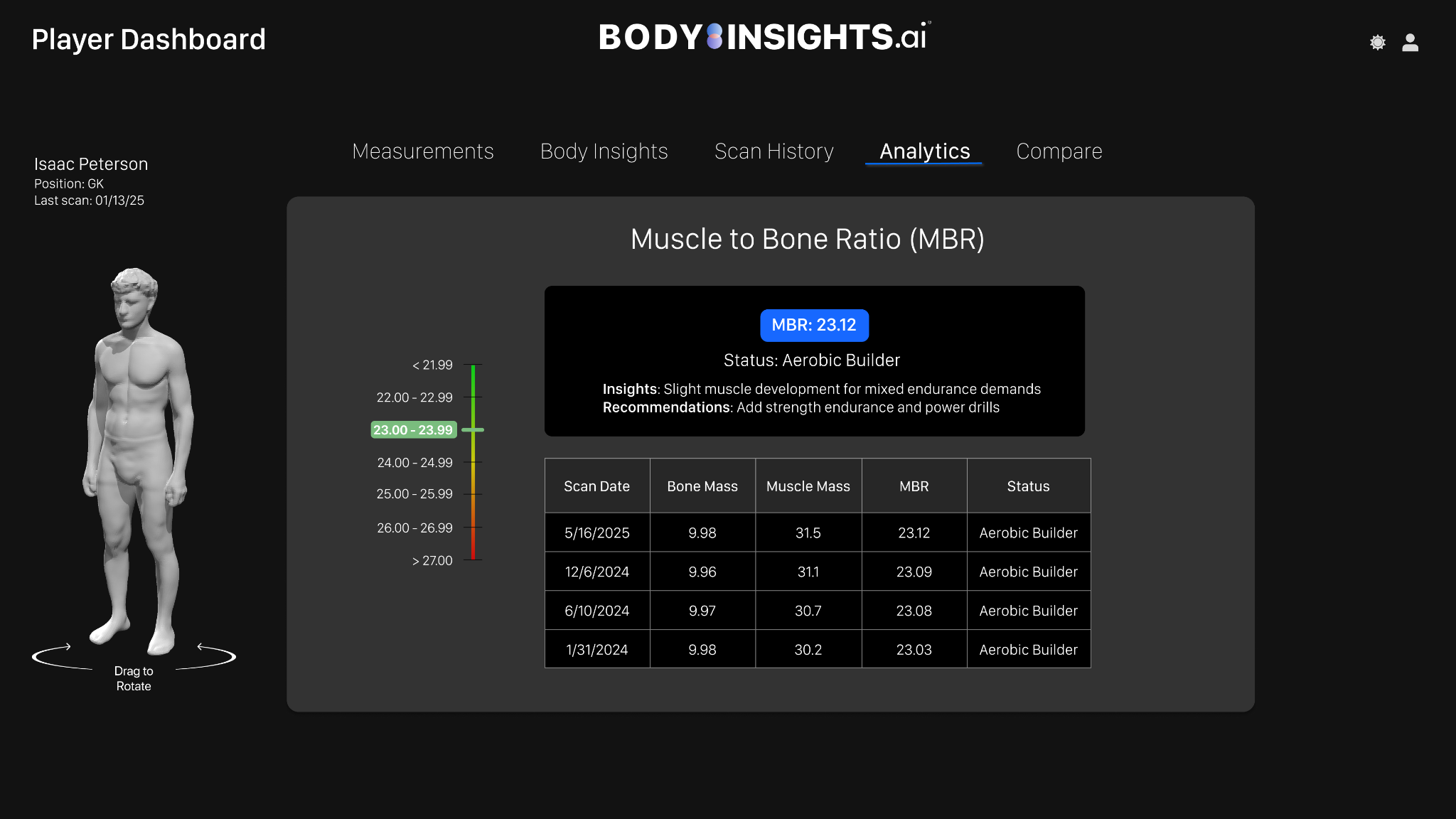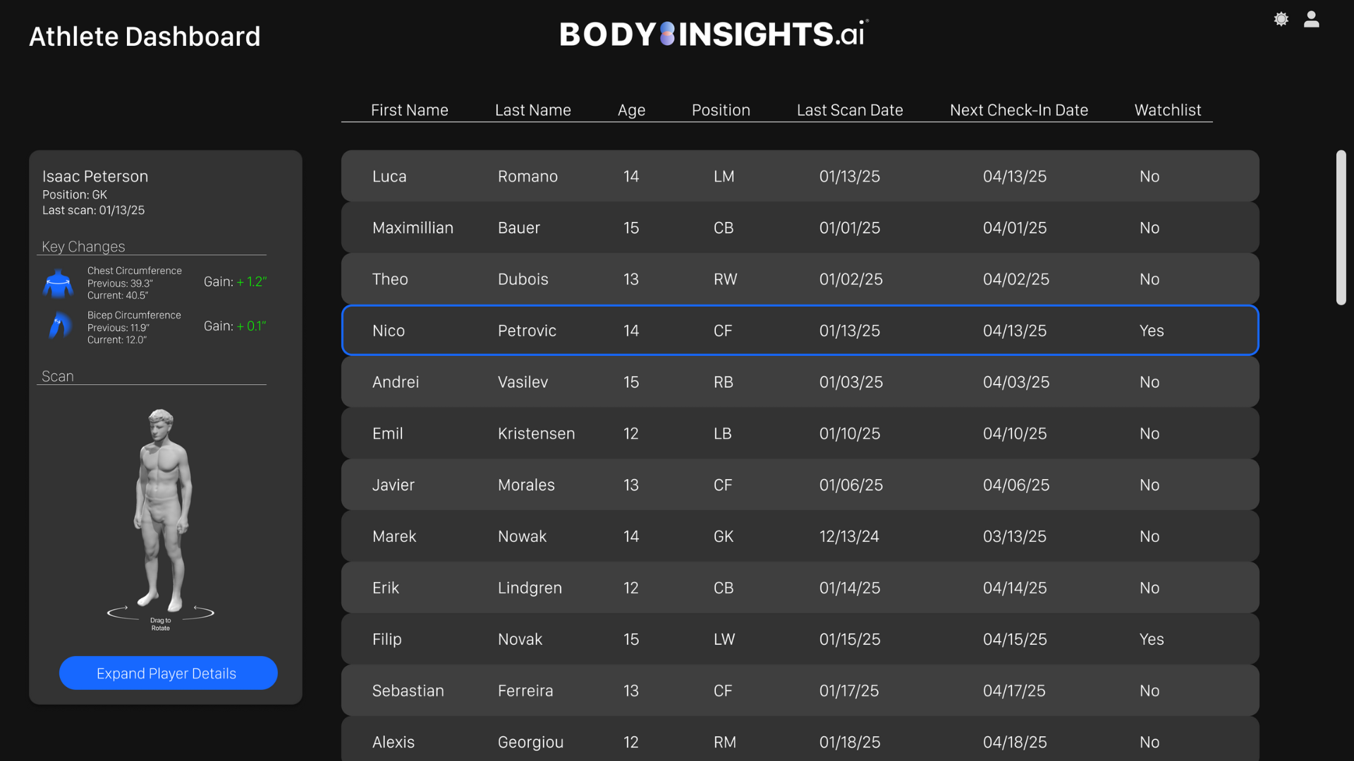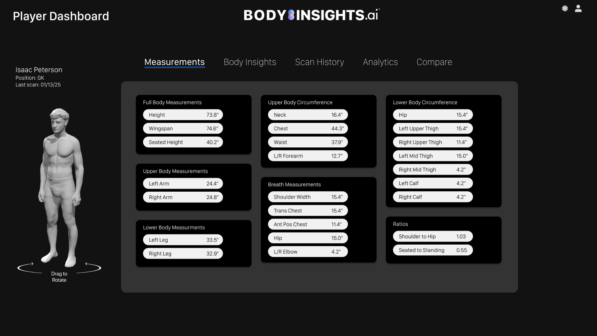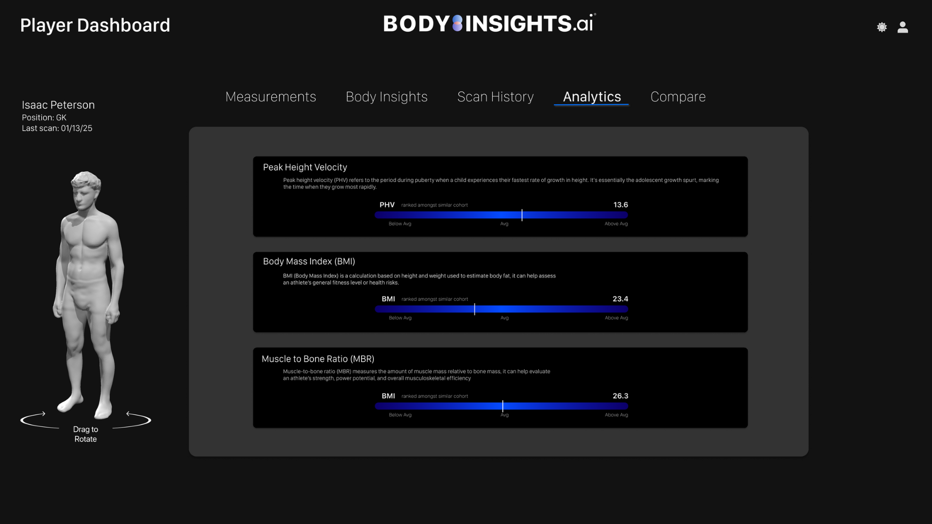 Analyze – The BodyInsights portal delivers 200+ anthropometrics, PHV, and body comp analytics.