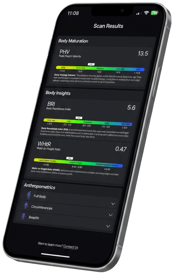 Access DEXA-grade insights through the BodyInsights platform, including biological maturation (PHV), 25+ anthropometrics, lean mass, fat mass, and bone mineral content, all delivered in real time.